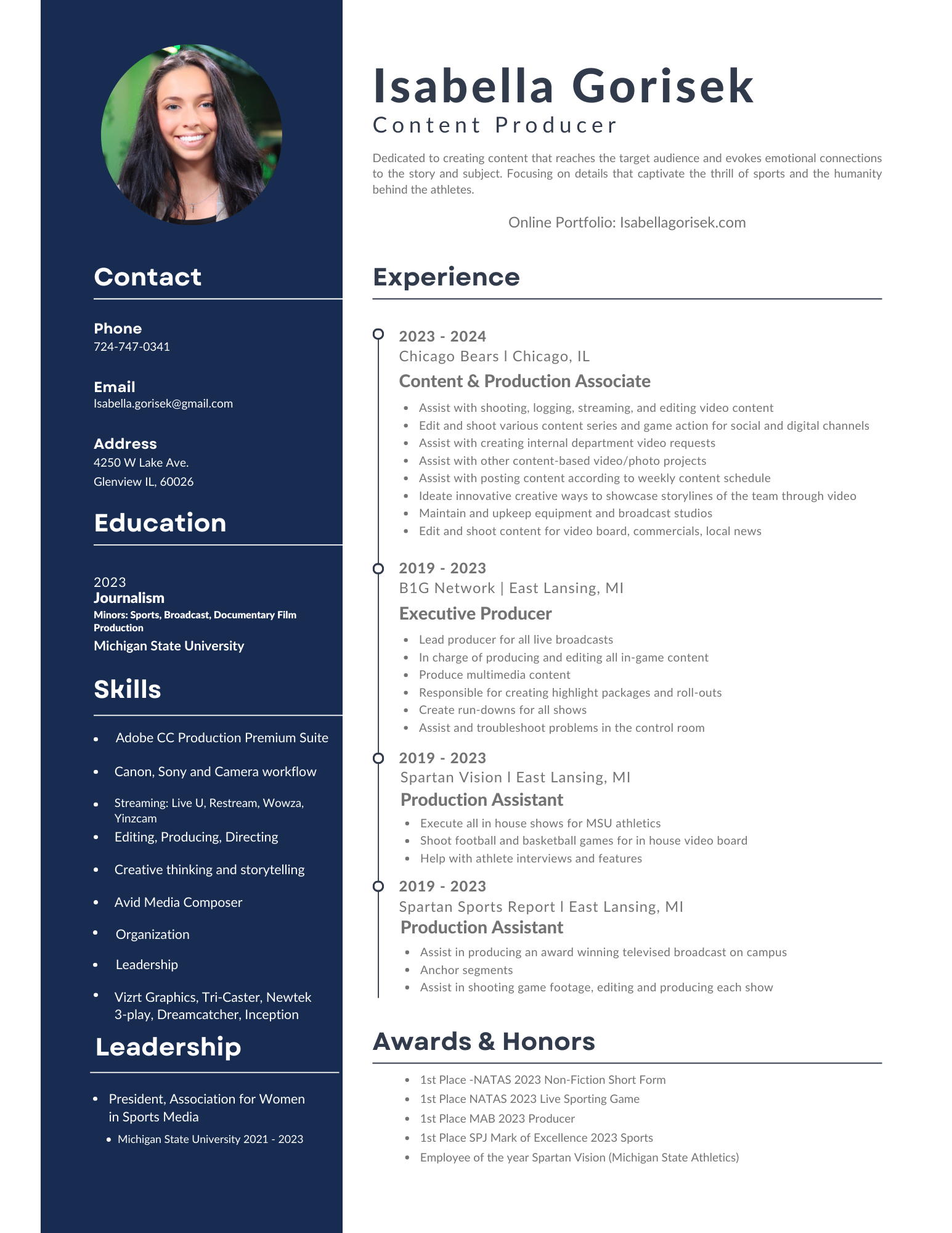 Iām so glad you are here! My name is Isabella Gorisek. I am from Pittsburgh Pennsylvania, and a recent graduate from Michigan State University. I am currently a content and production associate for the Chicago Bears. While at MSU I majored in Journalism, with minors in Broadcast, Sports journalism, and Documentary Film Production. As I continue to grow in my professional career, my main goal is to be a creative storyteller that allows the audience to understand a person or subject below the surface level.